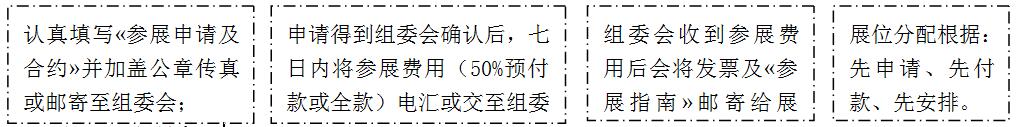 ◎ 特别提示:报名申请展位成功后,组委会将复函给予确认,七个工作日内将参展费用(全款或50%预付款)汇至组委会;组委会收到参展费用后即出具等额发票并邮寄给展商。