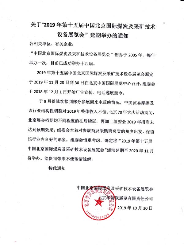 | “第十五届中国北京国际煤炭装备及采矿技术设备展览会”延期通知 | ||