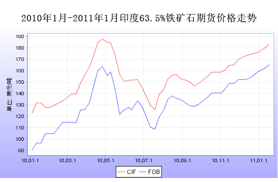 → 2010年1-2011年1月印度63.5%铁矿石期货价格走势