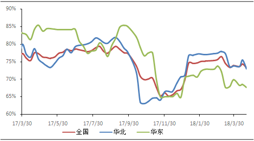 本周焦炭市场弱势运行,虽然各地频出环保督查消息,部分大型焦企已经就限产保价事宜进行商讨,市场心态受到较强支撑,下游贸易商认为抄底机会到来,询货现象增多。但就目前来看,焦企自主限产幅度有限,多数焦企出货压力较大,对后市市场信心不足,焦炭供应依然呈现宽松状态。下游钢企虽然消耗增加,但库存保持较高水平,消耗多以前期库存为主,控制到货量现象依然存在。焦煤价格下跌,为焦企提供了利润空间,减弱了焦企限产的意愿,间接增强钢企继续打压焦炭价格的信心,个别钢企已计划再次下调焦炭采购价格50元/吨。期货方面:20日焦炭主力1809收盘1840.0元/吨,环比13日上涨81元/吨(+4.60%)。持仓25.7万手,环比减少1.9万手,期货涨至峰点后下降。 供应:本周国内焦化厂产能利用率较上周小幅下降,主要主要是河北邢台和石家庄地区环保限产和山西等地区部分焦企开工小幅下降的影响。中联钢调研统计独立焦化厂新样本企业产能利用率73.17%,环比上周下降1.14个百分点。统计87家样本企业焦炭库存54.3万吨,较上周略增0.8万吨。焦炭供应充足,下游钢企打压焦炭价格,限制到货量,焦企库存略有上升。 图:焦化厂开工走势图