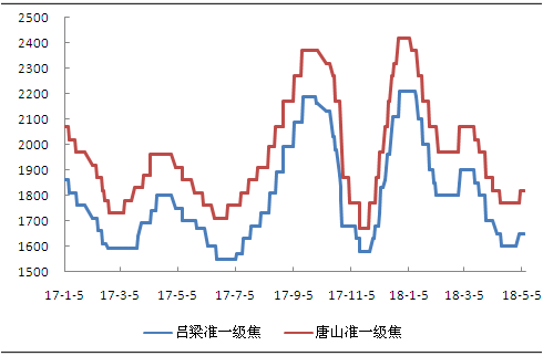 今日国内主流焦炭市场平稳。焦企焦炭库存下降,市场心态较好。下游钢企焦炭库存逐渐下降,接货的积极性提高。介于当前的焦炭市场,河北大型焦企焦炭价格上调50元/吨,明日起执行;山东地区焦炭价格于明日再次提涨50元/吨,累计涨幅100元/吨。乌海地区部分焦企由于焦煤短缺,限产30%,市场报价不断高涨。由于焦炭供应充足,多数钢企并不缺货,市场高价资源成交稀少。预计短期内焦炭价格第二次上调问题不大。 图:焦炭价格走势图