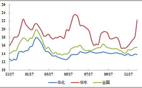市场价格:本周国内炼焦煤市场稳中偏弱。山西吕梁地区煤矿安全检查严格,中低硫主焦市场成交稳定,煤矿出货顺畅,S0.7G85报1730,S1.3G75报1360稳;高硫主焦煤受焦炭市场降价影响,价格小幅下行,S2.5G85降20-30报1050。运城地区瘦煤市场价格弱稳,部分资源下调50,S0.4G60出厂报1450;S0.5,G40到厂报1540。 炼焦煤供应:本周炼焦煤市场供给偏紧。山东济宁地区一煤矿发生煤矿事故,据悉该煤矿主产炼焦煤,该事件将进一步促进相关部门年底前严格检查,也让煤矿年底将保安全工作视为重中之重。山西地区部分煤矿年度生产计划完成,下旬有停产计划,或进一步加剧个别煤种偏紧状况。进口蒙煤市场稳定,通关继续低位,日通关量200车左右,货源相对紧张,价格稳,沙河驿提货价1560-1570元/吨。 需求方面:本周中联钢调研100家独立焦化企业平均开工率78.13%,环比上周减3个百分点。本周样本焦企开工率明显下降,主要是徐州地区焦企限停产所致。徐州市12月10日启动最严格的重污染天气红色应急管控,不能稳定达标的4家焦企停产,其余4家结焦时间延长至72小时,焦企开工环比大降,徐州地区炼焦煤需求通道基本瘫痪。样本企业炼焦煤总库存782.2万吨,环比上周减少2.8万吨;平均库存可用15.5天,环比上周略减0.02天。华北部分焦企采购难,近期库存有所下降。 图:重点地区焦企炼焦煤库存可用天数