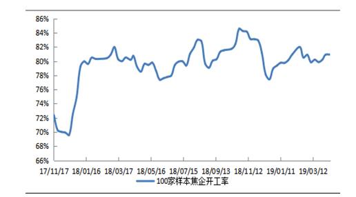 12日焦炭主力1909收盘2031.0元/吨,环比4日上升4.5元/吨(+0.22%),持仓32.0万手,环比上升16.3万手。本周焦炭市场暂稳,焦炭价格涨跌两难。主产地焦企虽然已有小幅亏损,挺价意愿强烈,但焦企开工依然稳中有升,焦炭供应充足;钢企焦炭库存小幅下滑,但整体库存依然偏高,个别钢厂仍有控制到货量;贸易商采购积极性略有提升,但港口库存持续高位,采购需求增量有限;焦煤价格继续小幅下滑,焦企成本支撑减弱,市场看稳情绪浓。 供给:本周中联钢调研统计独立焦化厂100家样本企业平均产能利用率80.93%,较上周上升0.02个百分点。近期在无新的环保政策条件下,焦企开工基本保持稳中略增,同时由于终端需求难有明显起色,焦炭供应依然相对充足。 图1:样本焦企开工走势图