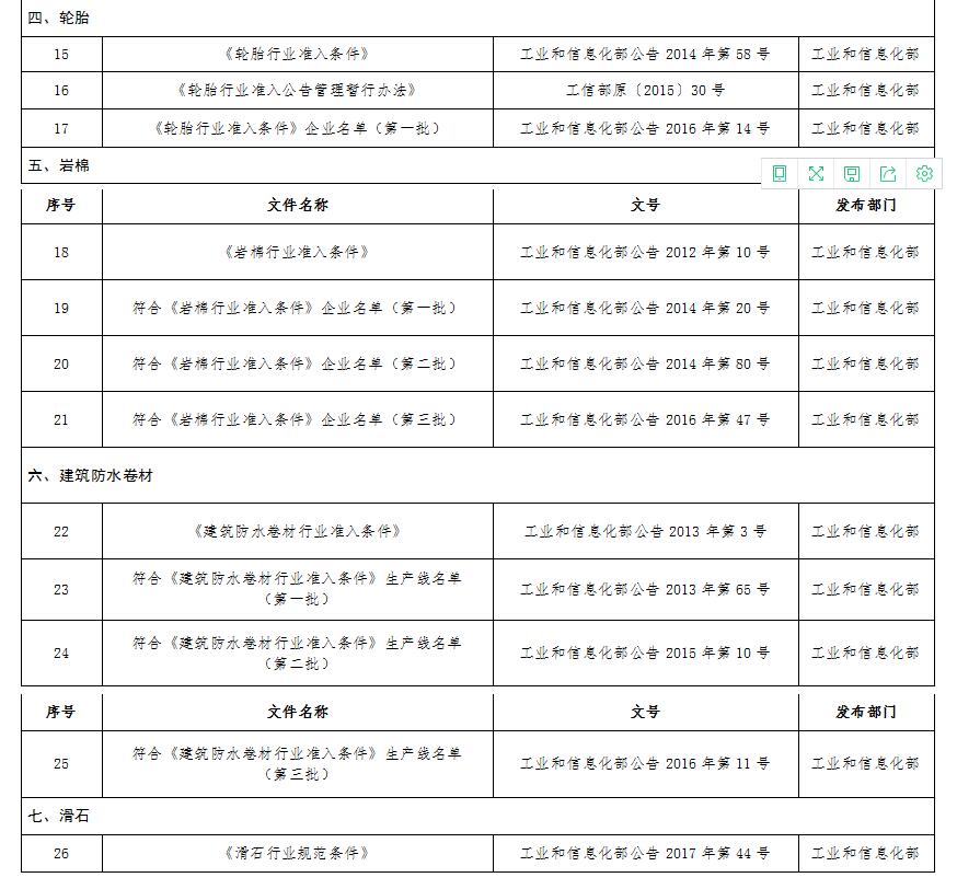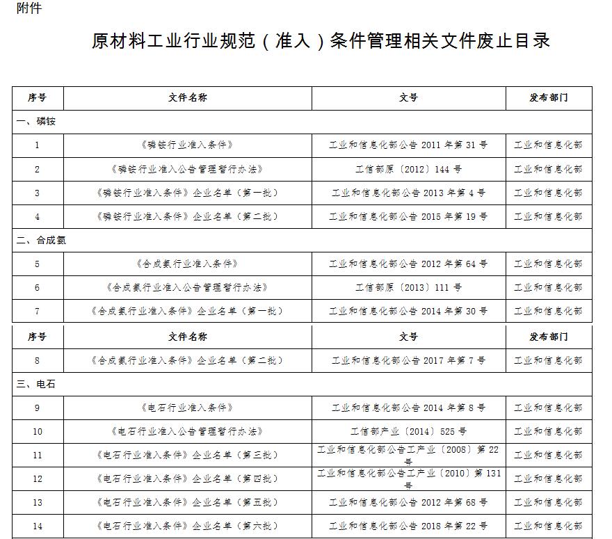 中华人民共和国工业和信息化部公告 2019年 第50号 为贯彻落实党中央、国务院关于转变政府职能和深化“放管服”改革的精神,经研究,我部决定自公告发布之日起废止《磷铵行业准入条件》(工业和信息化部公告2011年第31号)、《合成氨行业准入条件》(工业和信息化部公告2012年第64号)、《电石行业准入条件》(工业和信息化部公告2014年第8号)等26个原材料工业行业规范(准入)条件管理相关文件(详见附件)。 行业相关组织要充分发挥作用,加强行业自律建设,维护市场公平秩序,引导监督企业规范发展。 特此公告。 附件:原材料工业行业规范(准入)条件管理相关文件废止目录 工业和信息化部 2019年11月15日