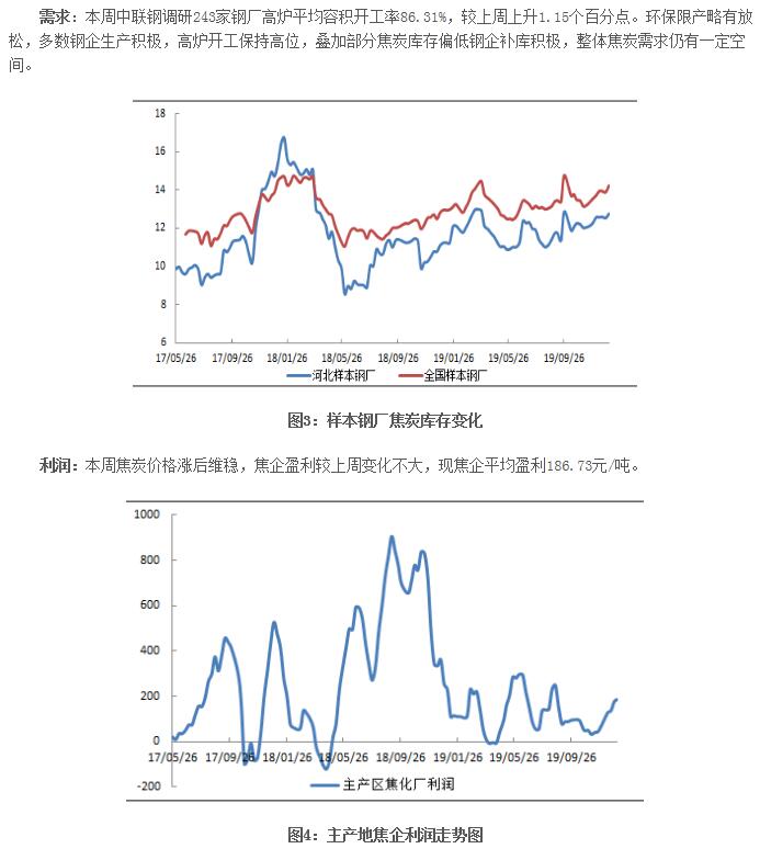 3日焦炭主力2005收盘1867.0元/吨,周环比上涨11.5元/吨(+0.62%),成交74.10万手,环比减少85.66万手。本周焦炭价格涨后暂稳。山西地区环保限产略有缓解,焦炭供应略有增加,部分钢企到货情况表现良好,焦炭库存上升,叠加钢材价格震荡,若钢企利润继续下滑,恐将打压焦炭价格,多数暂保持观望态度;但山东去产能继续推进,焦企出货顺畅,焦炭库存继续下降,叠加部分钢厂补库积极性尚可,焦炭市场心态依然良好。 供给:本周中联钢调研统计独立焦化厂100家样本企业平均产能利用率76.32%,较上周上升0.59个百分点。近期山西吕梁、运城等地区环保限产略有放松,焦企开工逐步上升,发运积极性高,焦炭供应有所缓解,但山东地区焦企去产能持续进行,焦炭区域性供应偏紧现象仍在。
