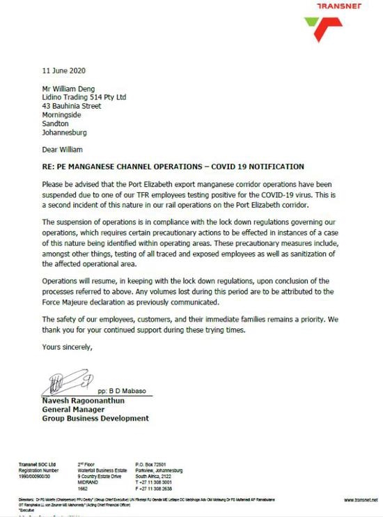 中国有色网消息,今晨,进口锰矿市场因一份南非港口文件而使得更多的进口锰矿商封盘(文件详情见附件),文件指出南非时间6月11日起伊丽莎白港(南非锰矿出口量最大的港口)因Transnet员工被确诊COVID-19呈阳性,伊丽莎白港出口锰通道业务进行暂停。