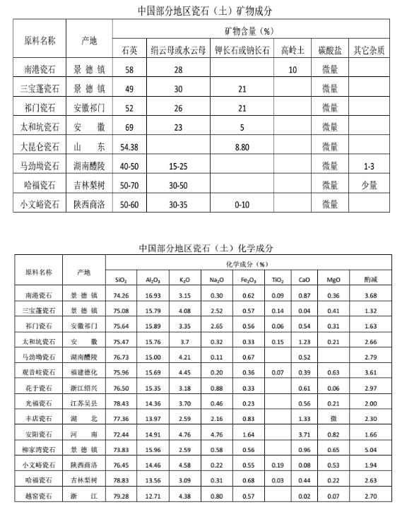 1、瓷石(土)名称:瓷石或瓷土,瓷石作为一种岩石,有石状和土状两种形态,呈石状者称之为瓷石,呈土状、泥状者称之为瓷土。瓷土和瓷石是两个既有联系又有区别名称,作为陶瓷原料,两者只有形态(构造)上差别,而无本质不同。 2、瓷石(土)成分:统计中国各地瓷石(土),矿物成分石英40~70%、绢云母和水云母15~30%,长石5~30%,高岭土0~10%;化学成分SiO2>70%,Al2O312~17%,K2O+Na2O 3~7%(其中K2O>Na2O),Fe2O3<1%,另外含少量CaO和MgO。