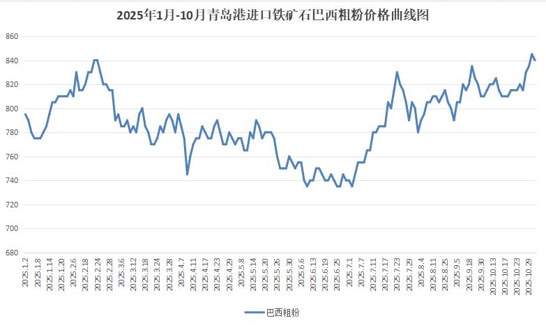 → 2025年1月-10月 青岛港进口铁矿石巴西粗粉价格曲线图