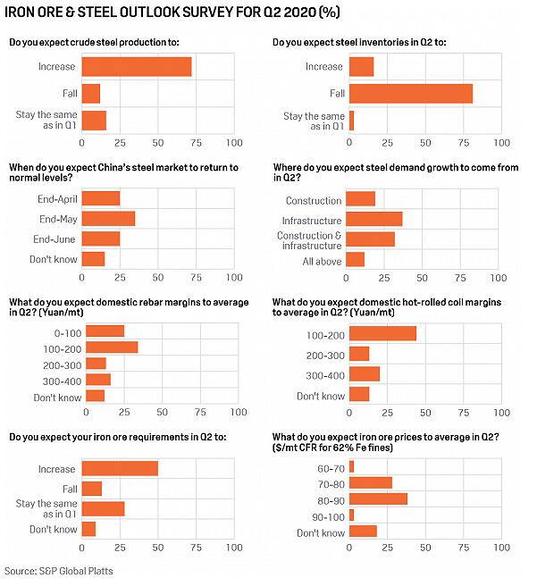 半数受访者认为二季铁矿石需求将增加,而28%的受访者认为会与第一季持平,只有13%的企业认为铁矿石需求可能下降。 尽管中国成品钢库存在飙升,但72%的受访者认为第二季度粗钢产量将增加。这一发现与此前的调查形成鲜明对比,当时超过三分之一的中国钢铁企业表示,它们正考虑减产。 这反映出国内钢铁市场开始转向乐观,虽然只有四分之一的受访者预计需求将在4月底前恢复正常。另外,约35%的企业认为市场将在5月底前完全复苏,25%的企业认为市场将在6月底前完全复苏。 “我们预计中国市场将在4月底恢复正常,但由于病毒在中国以外大蔓延,导致了很大不确定性。由于钢铁市场是全球性的,没有哪个国家能够只靠本土市场养活自己。”华北一位钢厂高管表示。 主要需求将来自基础设施投资 调查发现,37%的受访者预计钢铁需求增长将主要来自基础设施,而19%的受访者认为建筑将继续是需求增长的关键领域。 钢铁市场参与者预计,在冠状病毒爆发后,中国政府将在很大程度上利用基础设施来支持经济。 很少有受访者认为制造业将在二季度显著拉动钢铁需求,这反映在了热轧卷材利润前景上:多数(44%)受访者预计二季度中国国内热轧卷利润率将在100-200元人民币/吨(14-28美元/吨)的水平,而20%的人认为在300-400元人民币/吨。 一位钢厂的人士表示:“热轧卷市场将主要取决于家电和汽车需求,估计那些被压抑的需求在今年下半年才会显现出来,我们对二季度(需求)的强劲复苏毫无信心。” 螺纹钢利润率的前景极为悲观,四分之一的受访者认为利润率在100元人民币/吨或以下。预计到2020年,建筑行业的需求将会减弱,因为中国政府已经表示,坚持房住不炒,不会用房地产来刺激经济。