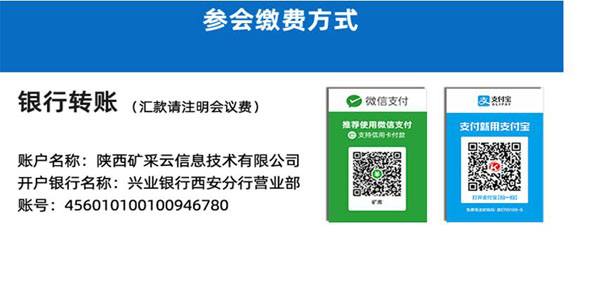 六、参会缴费方式(请认准会议指定缴费方式) 银行转账(汇款请注明会议费) 账户名称:陕西矿采云信息技术有限公司 开户银行名称:兴业银行西安分行营业部 账号:456010100100946780