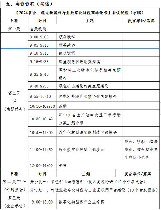 为贯彻落实《关于深入推进矿山智能化建设促进矿山安全发展的指导意见》、《原材料工业数字化转型工作方案(2024—2026年)》、《绿色矿山评价指标》、《有色金属行业智能工厂(矿山)建设指南(试行)》、《矿山安全生产治本攻坚三年行动方案(2024-2026年)》等相关政策,聚焦发展新质生产力,建设数字化矿山生态文明,矿库网、江西省锂电新能源产业技术研究院、宜春江理锂电新能源产业研究院、江西稀土行业数字化转型促进中心、江西锂电行业数字化转型促进中心、江西钨行业数字化转型促进中心等数字化转型综合服务平台,携手国内外数字化供应商、智能装备制造商、矿山智能化新装备与新技术厂商、数字化标杆企业,围绕绿色矿山、智慧矿山、矿山安全、锂电企业数字化等领域,将于2024年6月13日-15日在南昌召开《2024(第二届)矿业、锂电新能源行业数字化转型高峰论坛》。 本届论坛特邀行业专家、矿业头部企业等做主题报告,分享、探讨矿业、锂电新能源行业未来发展方向和趋势。同时邀请数字化解决方案提供商、智能装备制造商、矿业、锂电新能源等300余家企业共同探讨行业发展新路径,分享数字化解决方案、智能装备、行业新技术、矿山应用案例实践等。本届大会旨在驱动企业工艺、数据、生产模式创新,保障企业生产本质化安全,提升企业生产效率,为行业数字化水平提升赋能,与企业携手共进,助力实现有色金属产业高质量跨越式发展。 一、时间、地点、主题 会议时间:2024年6月13-15日 会议地点:江西·南昌 大会主题:促进数字化转型 助力新质生产力 二、组织机构 主办单位: 矿库网 中国矿业联合会民营矿业分会 江西省有色金属学会 联合主办单位: 江西省锂电新能源产业技术研究院 宜春江理锂电新能源产业研究院 江西稀土行业数字化转型促进中心 江西锂电行业数字化转型促进中心 江西钨行业数字化转型促进中心(江钨集团) 中国机电产品流通协会智能化矿山分会 承办单位: 江西镝铒智能科技有限公司 中矿信息技术有限公司 北京矿酷数科信息技术有限公司