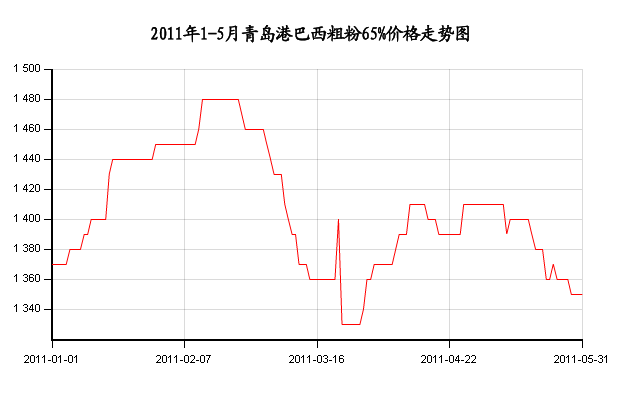 → 2011年1-5月青岛港巴西粗粉65%价格走势