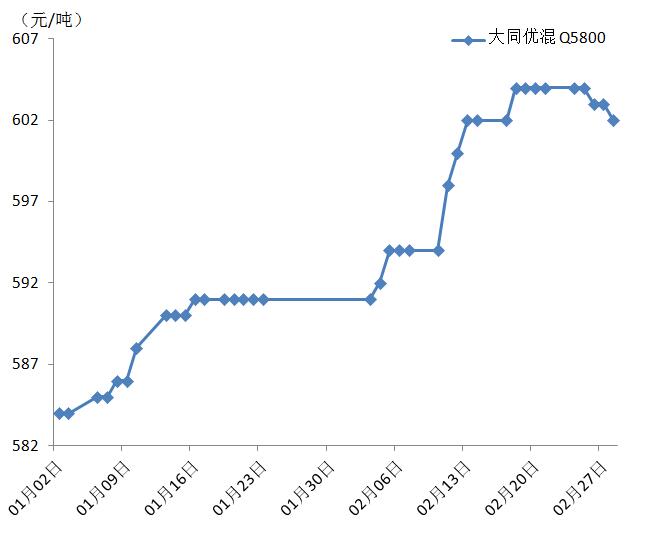 2020年1月-2月 秦皇岛港动力煤价格走势图