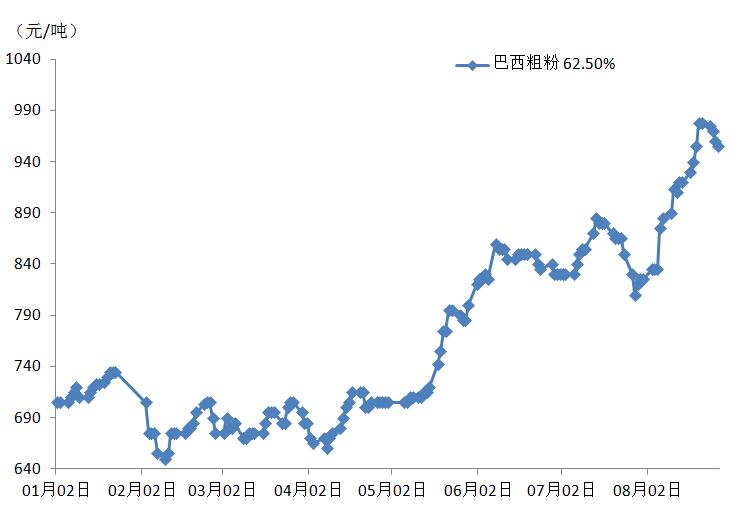 → 2020年1月-8月青岛港巴西粗粉价格走势图