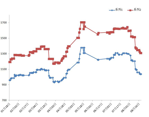 → 2020年1月-8月河北地区铁精粉价格走势图