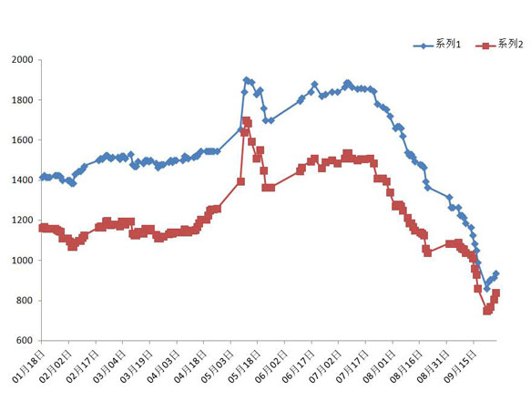 2021年1月-9月 天津港PB块、PB粉价格走势图