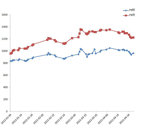 2022年1月-4月 天津港PB块、PB粉价格曲线图