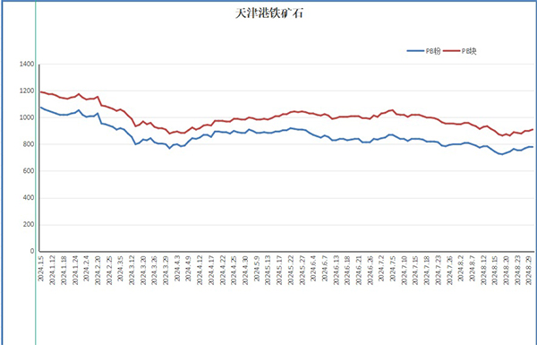 → 2024年1-8月天津港PB粉、PB块价格曲线