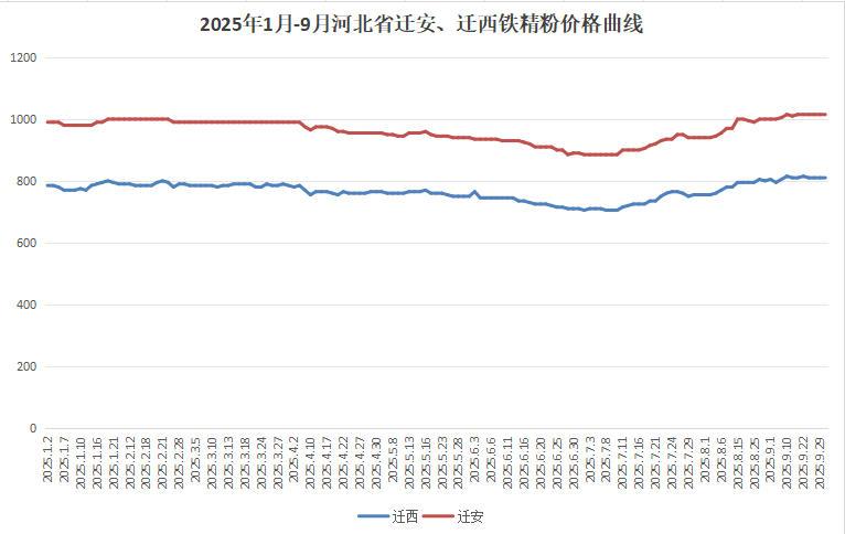 2025年1月-9月河北省迁安、迁西铁精粉价格曲线