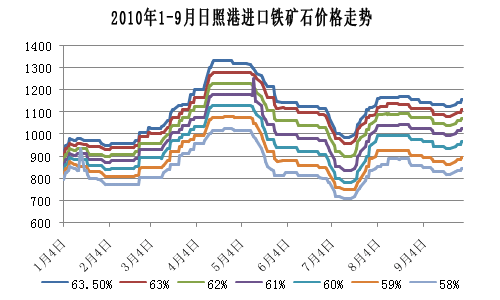 2010年1-9月日照港进口印度铁矿石价格走势图