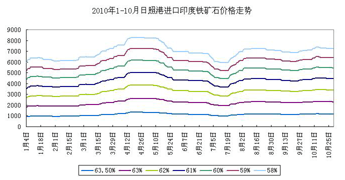 2010年1-10月日照港进口印度铁矿石价格走势图